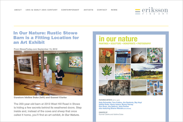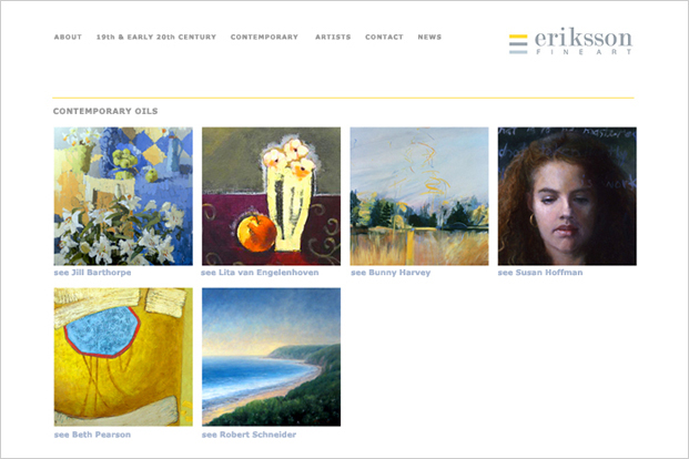 DESCRIPTION Online gallery of artists represented by Eriksson Fine Art, a consulting service for corporations, private collectors, and interior designers.