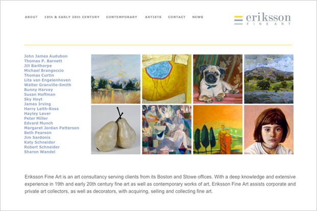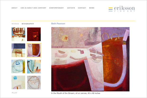DESCRIPTION Online gallery of artists represented by Eriksson Fine Art, a consulting service for corporations, private collectors, and interior designers.