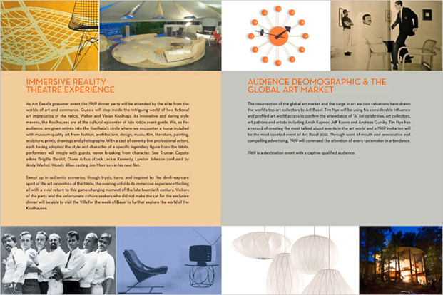 Illustrated prospectus for an exhibition and art performance conceived for Art Basel, Switzerland 2013. Staged inside an elegant Swiss villa, 1969 creates an immersive environment of art, vintage interiors, and brave new gadgets of the 1960s. Guests step inside the intriguing world of two fictional characters, Walter and Vivian Koolhaus.